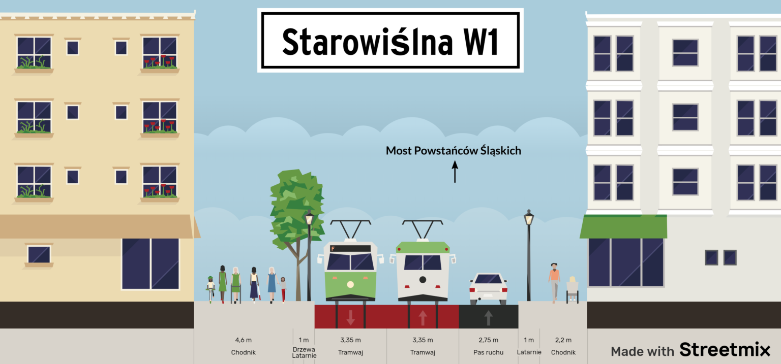 Grafika “Starowiślna W0” przedstawia typowy przekrój odpowiadający przygotowanej w 2016 roku Koncepcji przebudowy torowiska tramwajowego w ul. Starowiślnej.