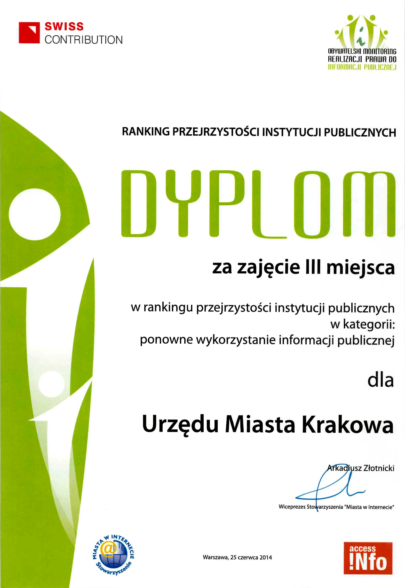 Urząd Miasta Krakowa okazał się najlepszy w kategorii „Dostęp do informacji publicznej" (dyplom). Natomiast trzecie miejsce zajęliśmy we kategorii „Ponowne wykorzystanie informacji publicznej" (dyplom).