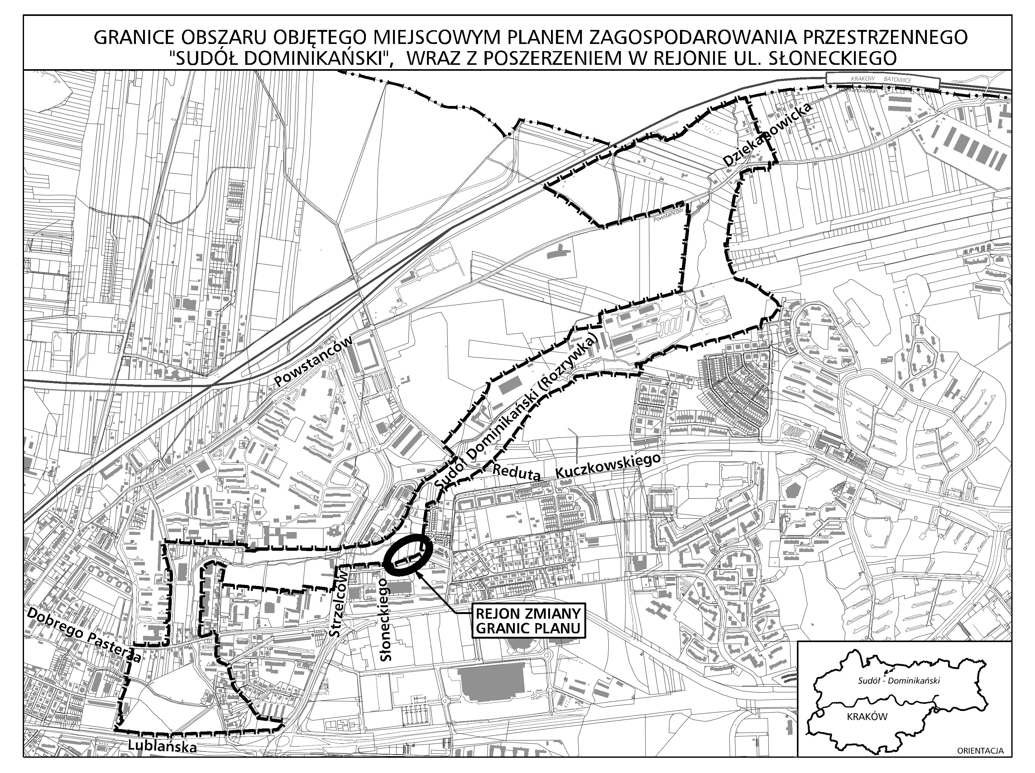 Uchwała Nr XI/163/07, o której mowa powyżej, dotyczy poszerzenia obszaru objętego sporządzanym planem. W związku ze zmianą, obszar planu obejmuje tereny położone po obu strona cieku wodnego Sudół Dominikański (pot. Rozrywka), na odcinku pomiędzy ulicą Lublańską a północną granicą Miasta Krakowa, wraz z poszerzeniem w rejonie ul. Słoneckiego.
