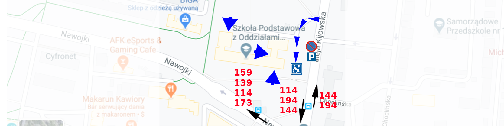 linie autobusowe: 159, 139, 114, 173, 114, 194, 144 (przystanek Kawiory)