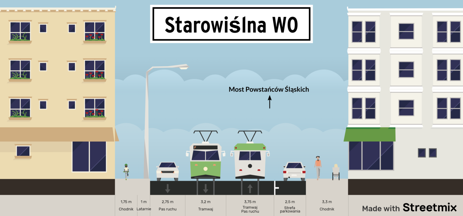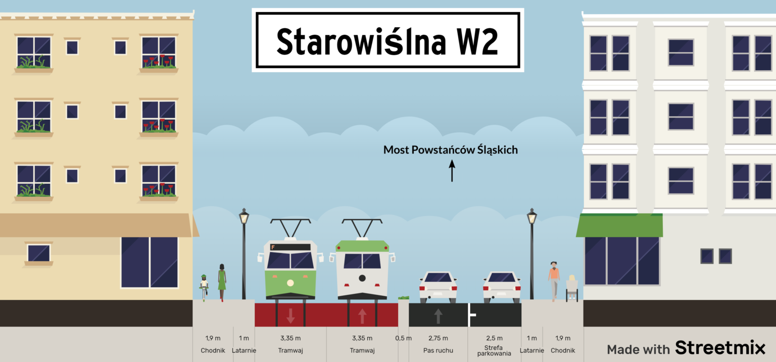 Grafika “Starowiślna W0” przedstawia typowy przekrój odpowiadający przygotowanej w 2016 roku Koncepcji przebudowy torowiska tramwajowego w ul. Starowiślnej.