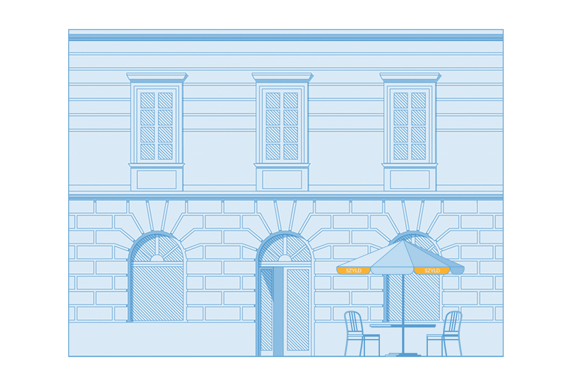 Szyld należy sytuować płasko na elewacji budynku albo w witrynie na nie więcej niż 20% jej powierzchni albo na wysięgniku