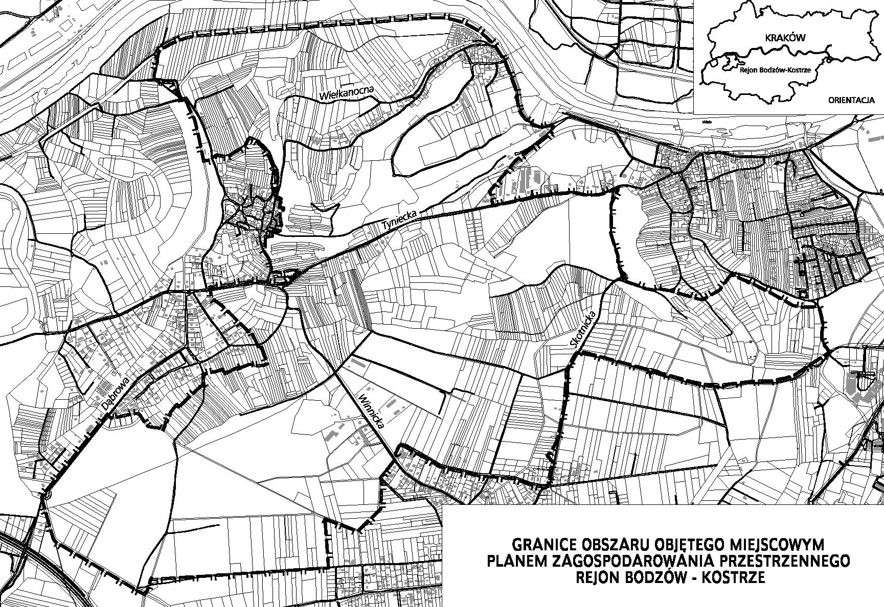 Fragment z uzasadnienia przystąpienia do sporządzenia planu: Plan ma na celu realizację zasady zintegrowanej ochrony środowiska przyrodniczego i kulturowego, obejmujący obszar o najwyższych wartościach krajobrazowych i kluczowym znaczeniu dla utrzymania ciągłości systemu przyrodniczego miasta. W obszarze planu znajdują się punkty i ciągi widokowe o dużej skali zasięgu widocznych panoram w miejscach szerokich otwarć terenowych. Ponadto w granicach planu znajdują się obiekty fortyfikacji Twierdzy Kraków (m.in. fort Bodzów i Winnica) wpisane do rejestru zabytków. Oprócz potrzeby ochrony środowiska przyrodniczego przystąpienie do sporządzenia miejscowego planu zagospodarowania przestrzennego dla obszaru "Bodzów - Kostrze" podyktowanie jest również potrzebą zachowania jednoznacznego rozgraniczenia terenów niezabudowanych od zainwestowanych i przeznaczonych do zainwestowania oraz harmonijne kształtowanie zabudowy tego obszaru. Obszar "Bodzów - Kostrze" objęty jest sporządzanym aktualnie przez Dyrekcję Zespołu Jurajskich Parków Krajobrazowych projektem planu ochrony Bielańsko-Tynieckiego Parku Krajobrazowego na podstawie art. 13a ustawy o ochronie przyrody. Miejscowy plan zagospodarowania przestrzennego pozwoli stabilizować zasady zagospodarowania przestrzennego w całym obszarze poprzez kompleksowe rozwiązania obejmujące kompozycję funkcjonalno-przestrzenną, uwzględniającą: relacje z terenami otaczającymi, kształtowanie systemów zieleni oraz zabudowy.