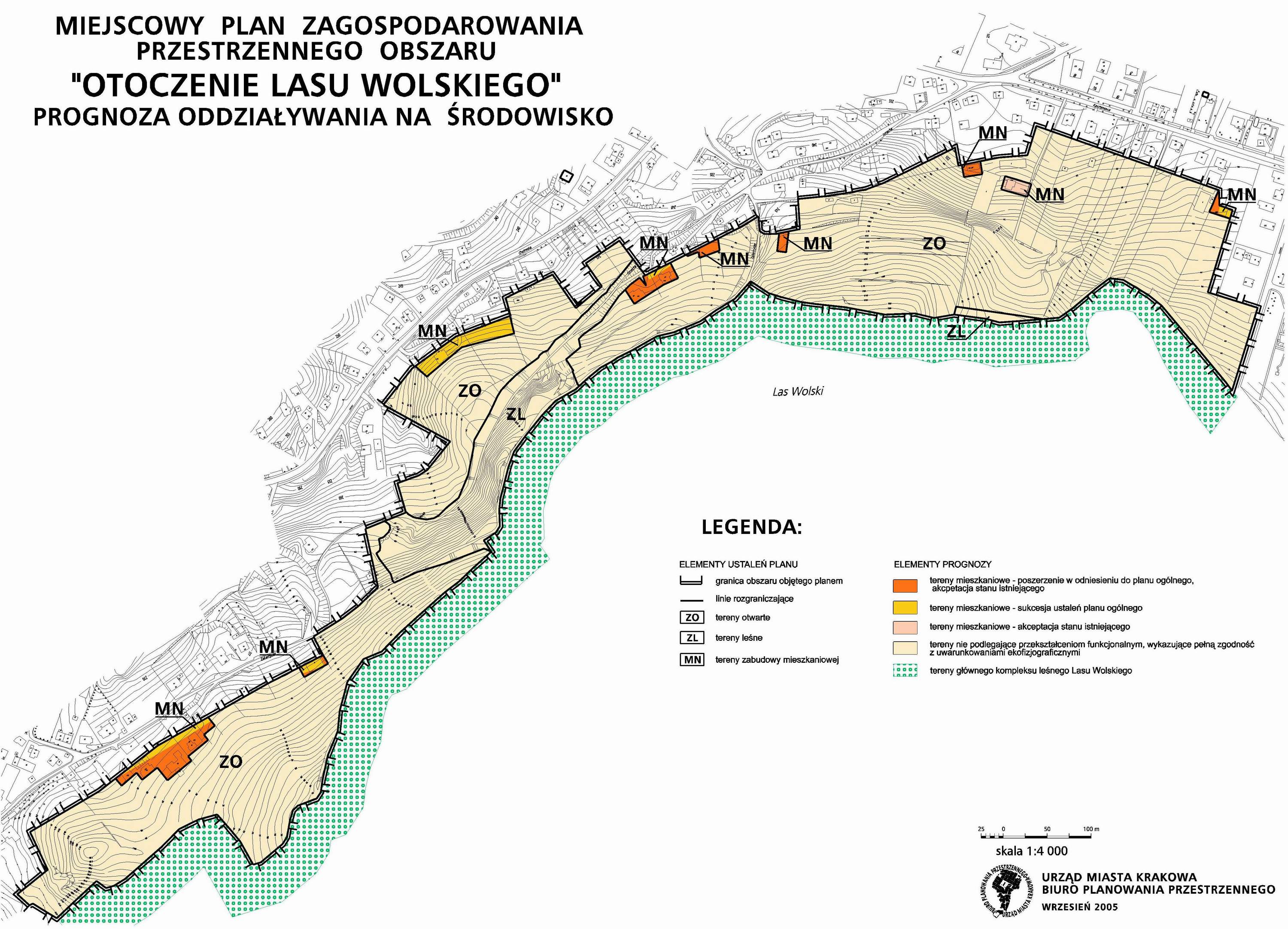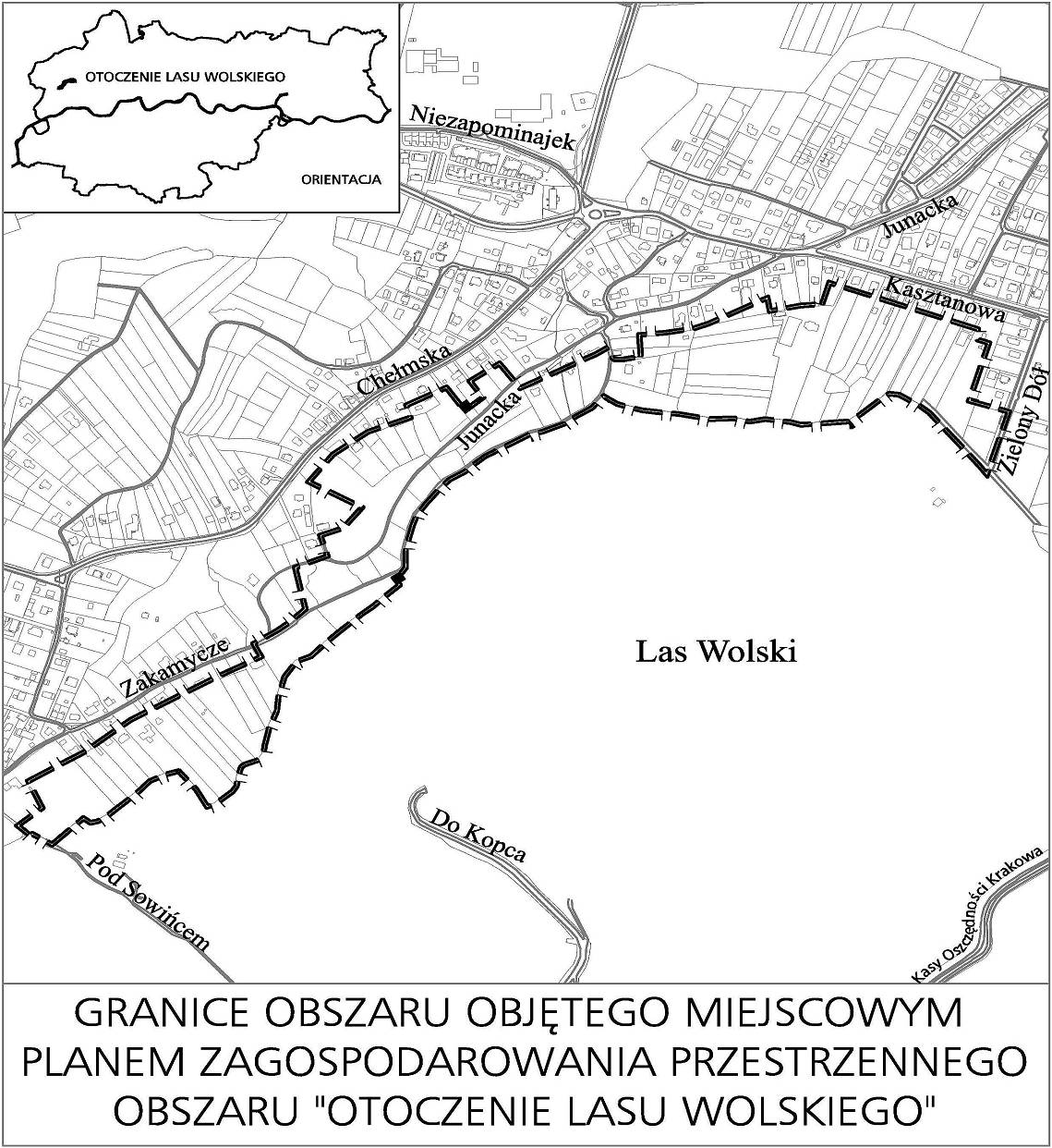 Fragment z uzasadnienia przystąpienia do sporządzenia planu: Plan o charakterze ochronnym, obejmujący obszar o najwyższych wartościach, mający, tak jak "Rejon Fortu Skała" i "Wzgórze Św. Bronisławy" ważne znaczenie dla równowagi przestrzennej miasta i jego atrakcyjności, ma celu obronienie przed niepożądaną urbanizacją bezpośredniego otoczenia Lasu Wolskiego.