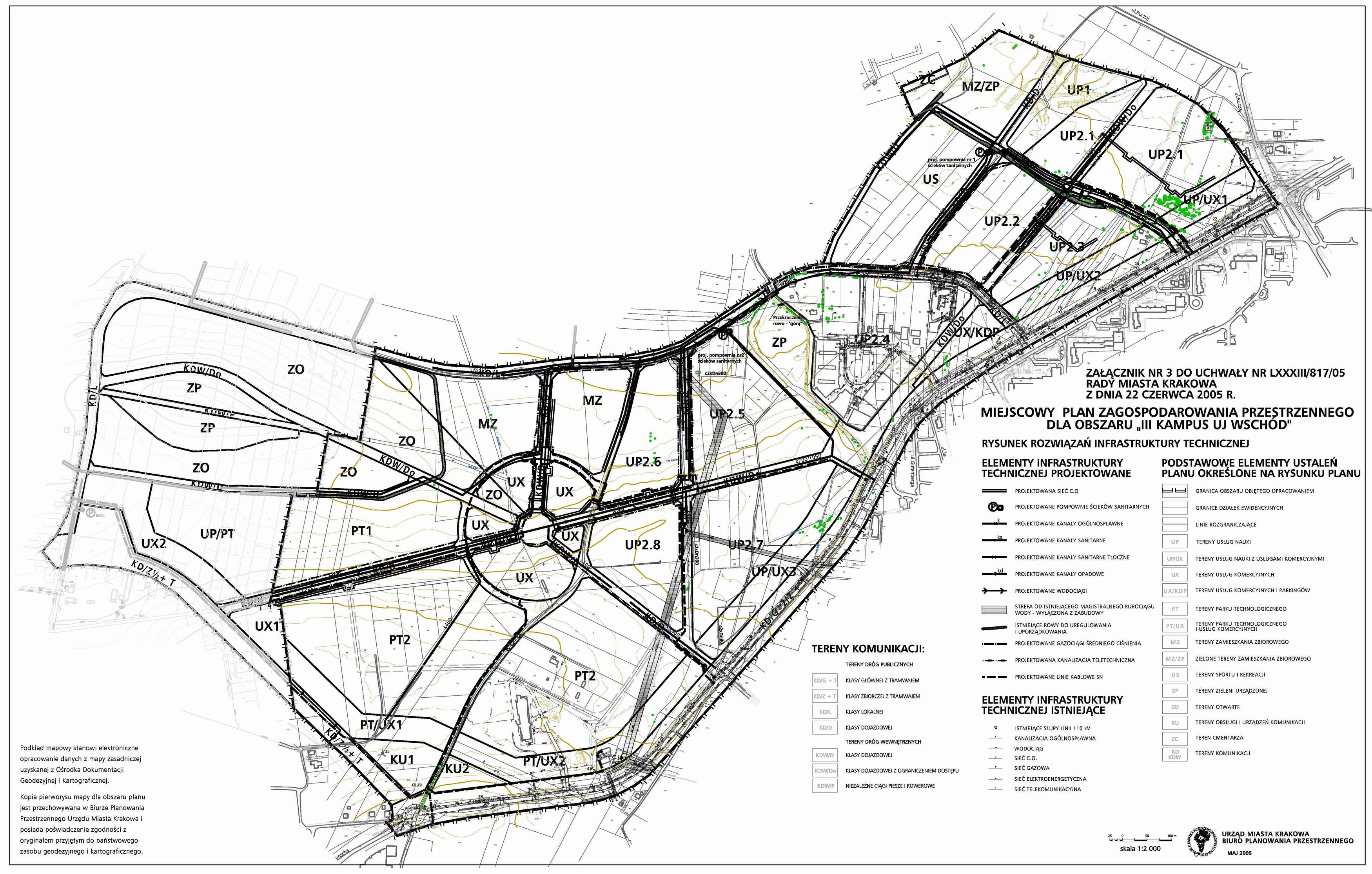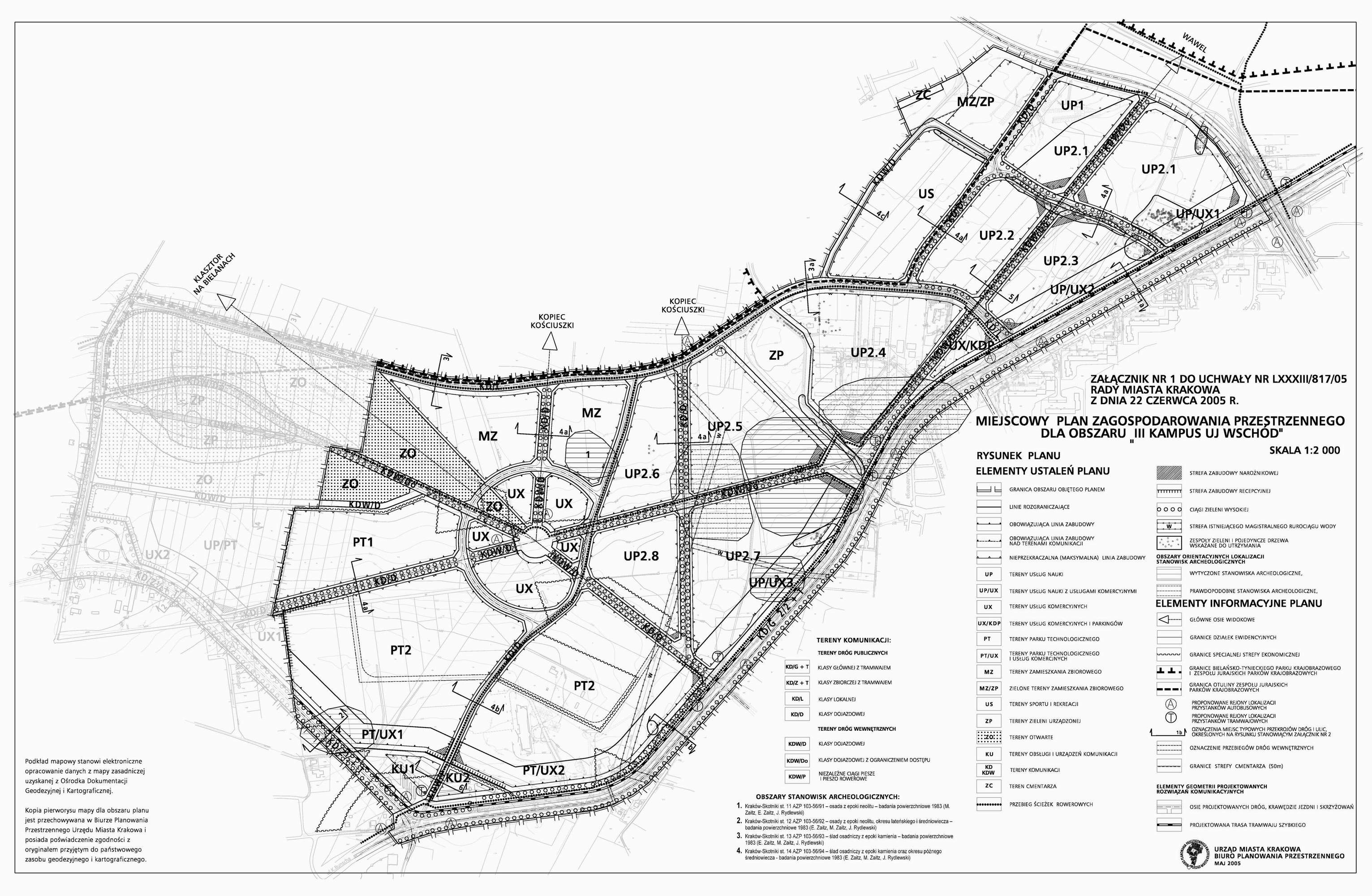 Obszar objęty miejscowymi planami zagospodarowania przestrzennego "III Kampus UJ - Wschód" i "III Kampus UJ - Zachód" położony jest w środkowo wschodniej części Krakowa w rejonie ul. Gronostajowej, Bobrzyńskiego, Grota-Roweckiego - w odległości ok. 4 km na zachód od centrum Krakowa. Położony jest również na skraju Zespołu Jurajskich Parków Krajobrazowych, po zewnętrznej stronie ich otuliny, stanowiąc tym samym fragment jej południowego przedpola. Obszar Kampusu to część terenów dawnych wsi podkrakowskich: Pychowic, Skotnik i częściowo Kobierzyna. Od północy obszar ograniczony jest rozłogiem pól Skotnik i zagajnikiem (na zakończeniu ul. Gronostajowej). Od wschodu przebiega projektowana ul. Pychowicka, za którą znajduje się wzniesienie Skał Twardowskiego (235 m n.p.m.) z bardzo atrakcyjnym zbiornikiem wodnym Zakrzówek (naturalnym zalewem w dawnym kamieniołomie). Od południa - wzdłuż ul. Grota-Roweckiego i ul. Bobrzyńskiego obszar graniczy z zabudową mieszkaniową wielorodzinną os. Ruczaj - Zaborze, a od południowego - zachodu z zabudową mieszkaniową jednorodzinną Skotnik. Celem planów było stworzenie prawa lokalnego, ułatwiającego realizację programów inwestycyjnych głównych inwestorów na tych terenach: Uniwerystetu Jagiellońskiego, Papieskiej Akademii Teologicznej, Polskiej Akademii Nauk, a także - w części - Parku Technologicznego (w obszarze Specjalnej Strefy Ekonomicznej). Ze względu na zróżnicowane funkcje w całym obszarze, etapowanie programów inwestycyjnych głównych inwestorów oraz stan własności gruntów - obszar III Kampusu UJ podzielono na dwa obszary planów, sporządzanych w oparciu i "Plan koordynacyjny..." - opracowany na Politechnice Krakowskiej pod kierunkiem Prof. Aleksandra Böhma. Kompozycja przestrzenna obszaru opiera sie na założeniu urbanistycznym wykorzystującym istniejące tu walory krajobrazowe. Założenie to zachowuje i uwzględnia powiązania widokowe obszaru z najbardziej charakterystycznymi elementami krajobrazu Krakowa, jak: Wzgórze Wawelskie, Kopiec Tadeusza Kośicuszki, klasztor Kamedułów na Bielanach. Zaprojektowane osie widokowe przecięte zostały kolejnymi osiami kompozycyjno-widokowymi, które wyznaczyły kwartały inwestycyjne. Przestrzeń pomiędzy kwartałami stanowi przestrzeń publiczną, która będzie realizowana jako atrakcyjne aleje, ulice, place, dziedzińce, wyposażone w szpalery drzew, małą architekturę, oświetlenie. Uchwalone plany miejscowe umożliwią realizację m.in. obiektów dydaktycznych i badawczych szkolnictwa wyższego, usług komercyjnych (centra konferencyjne, wystawiennicze), obiektów Parku Technologicznego (m.in. centra technologiczne, obiekty produkcyjne wysokich technologii, obiekty biurowe). Przewidziano tutaj również możliwość lokalizacji domów studenckich oraz urządzeń i obiektów sportowych. W oparciu o plan powstanie nowoczesny kompleks obiektów uniwersyteckich wraz z towarzyszącą zabudową, zielenią i infrastrukturą. Zespół ten o uporządkowanym układzie urbanistycznym i dobrej architekturze przyczyni się do utrwalenia znaczenia Krakowa w Europie, jako miasta uniwersyteckiego