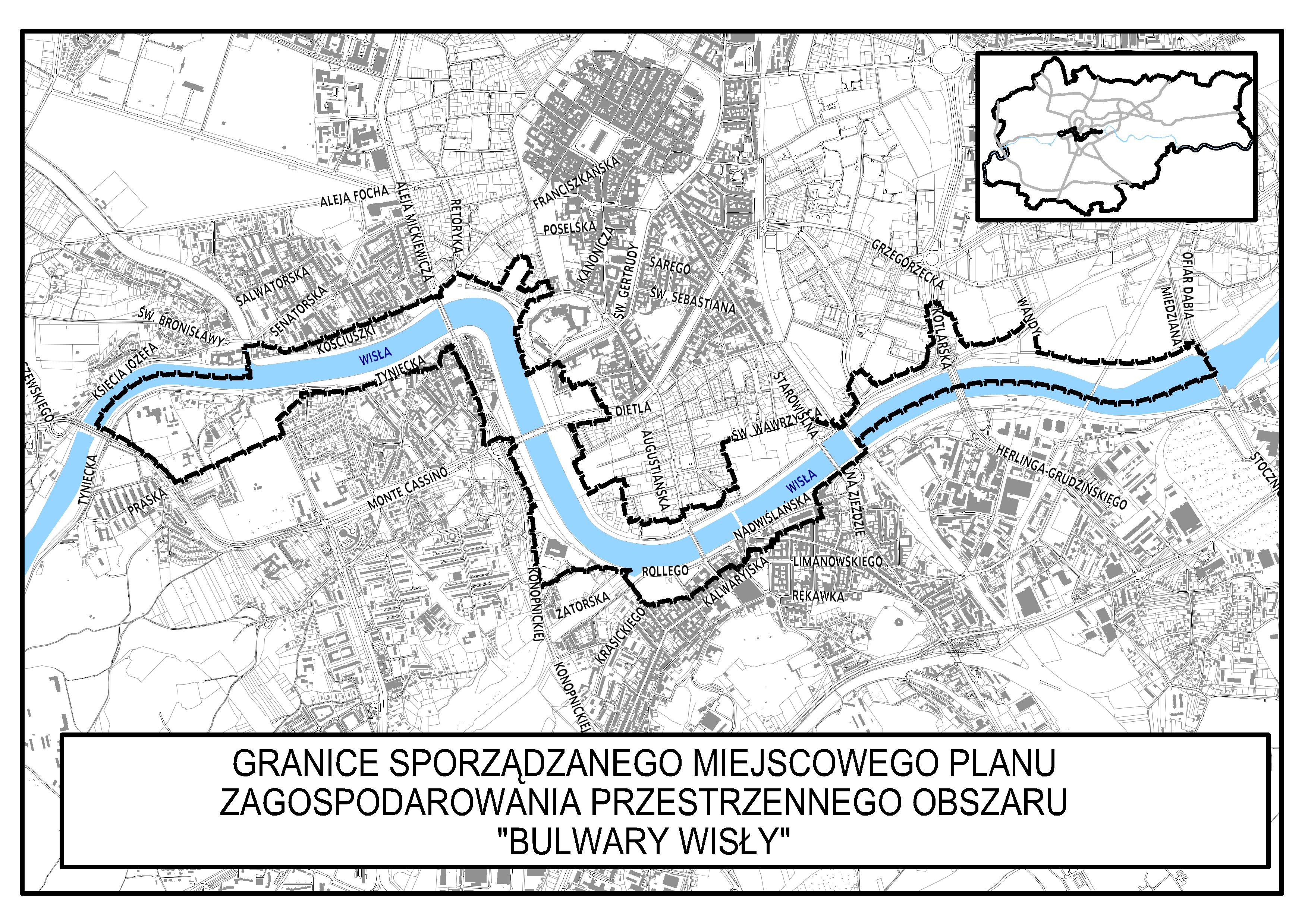 Obszar objęty sporządzanym planem położony jest w centralnej części Krakowa, w dolinie rzeki Wisły – od Mostu Zwierzynieckiego do Stopnia Wodnego "Dąbie", w granicach dzielnic: VII Zwierzyniec, VIII Dębniki, I Stare Miasto, II Grzegórzki, XIII Podgórze.