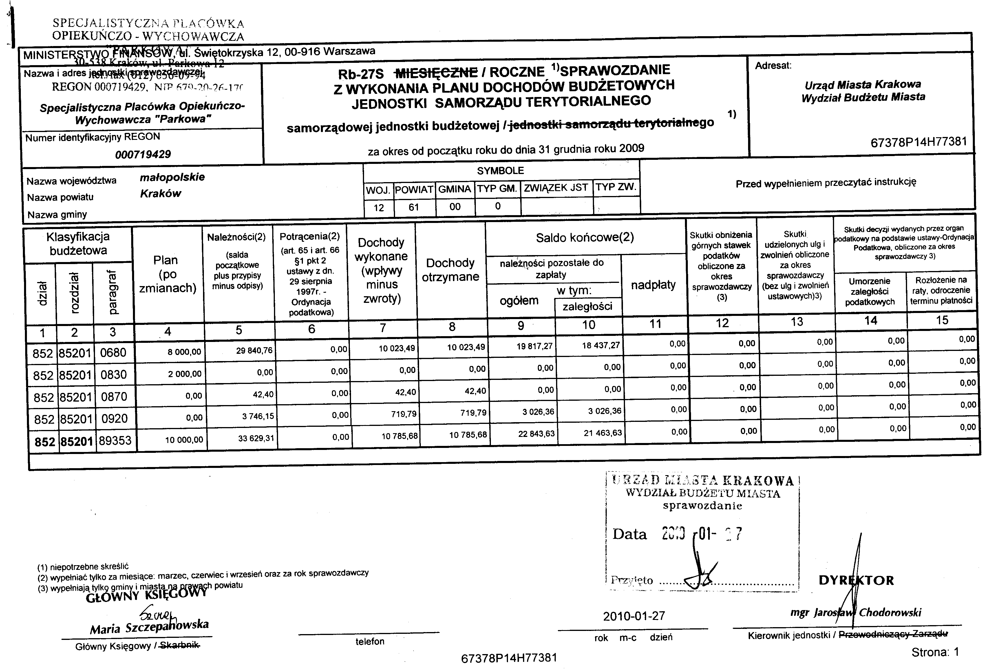 - Sprawozdanie z wykonania planu dochodów budżetowych samorządowej jednostki budżetowej Rb-27S za okres sprawozdawczy od początku roku do dnia 31 grudnia 2016 roku